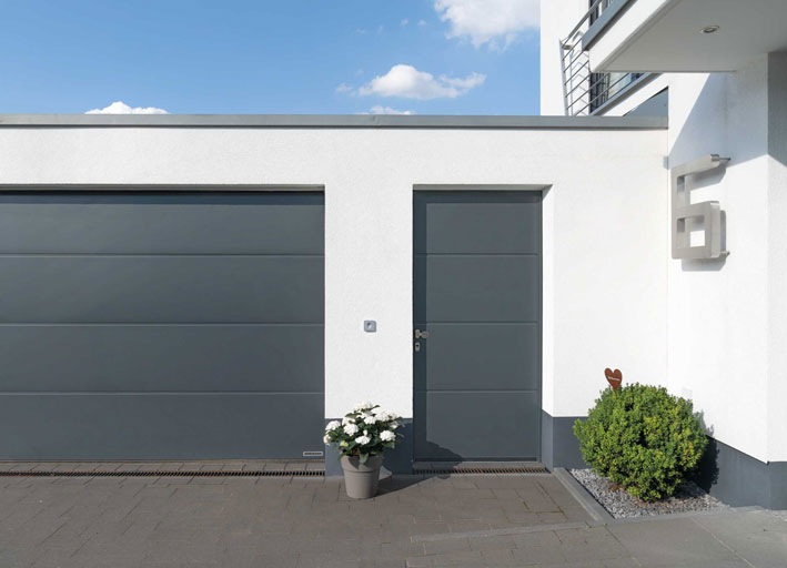 Seiten-Sektionaltore eignen sich durch ihre Bauart für viele, auch schwierige Einbausituationen, wie z.B. bei Dachschrägen. Dabei bleibt die volle Durchfahrtshöhe erhalten. Und für den einfachen Personendurchgang können Seiten-Sektionaltore auch nur teilweise geöffnet werden.